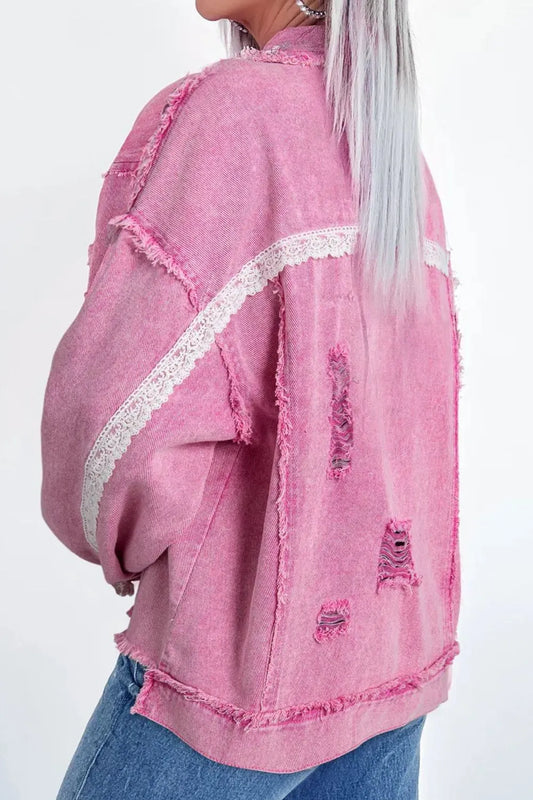 Lace Detail Distressed Raw Hem Long Sleeve Denim Jacket